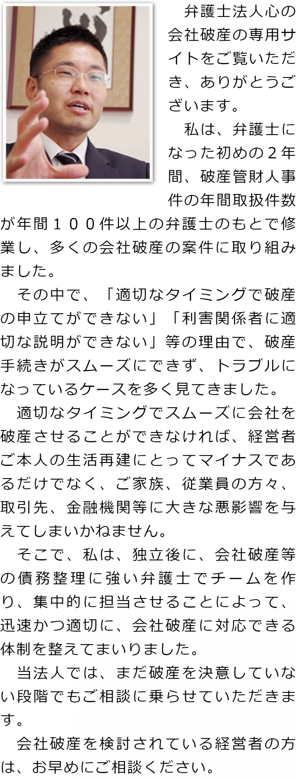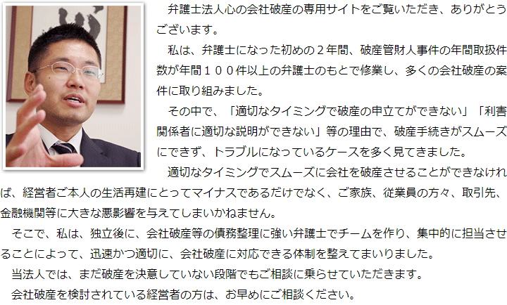 トップその他代表メッセージ 階層構造▼ その他(目次) 代表メッセージ その他(目次)その他トップ共通バナー元※削除不可新着情報(心グループニュース)電話・テレビ電話相談について代表メッセージ相談するタイミングを迷われている方へ金融機関との関係を壊したくない方へお客様相談室グループ概要費用詳細心グループのメディア出演実績マスコミ関係者の方へ関連リンクプライバシーポリシー 受付時間 平日 9時~21時、土日祝 9時~18時 夜間・土日祝の相談も対応します(要予約) 所在地 〒286-0033 千葉県成田市花崎町801-1京阪成田ビル6F 0120-41-2403 お問合せ・アクセス・地図