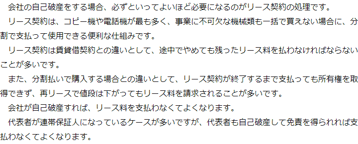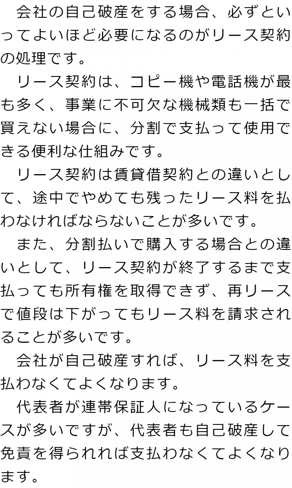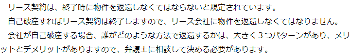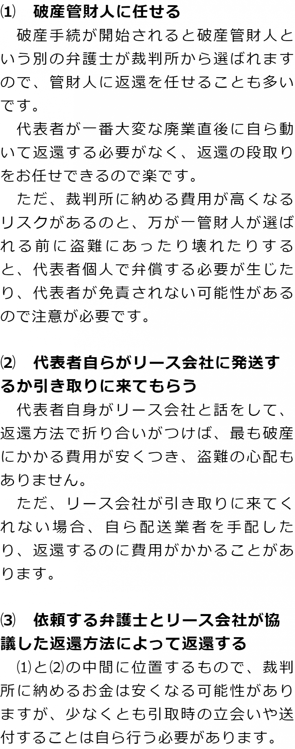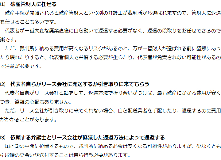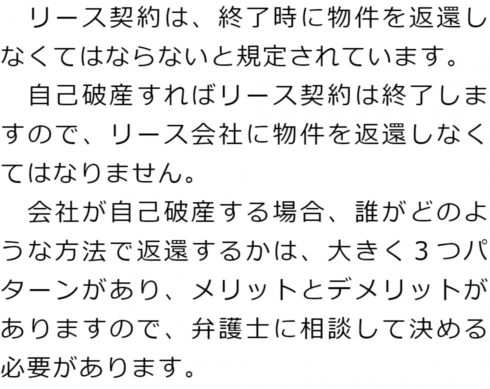 会社破産とリース契約の取り扱い1 リース料は破産によって支払わなくてよくなる2 リース物件は返還しなければならない3 リース物件の返還のパターン別メリットとデメリット 1 リース料は破産によって支払わなくてよくなる2 リース物件は返還しなければならない3 リース物件の返還のパターン別メリットとデメリット