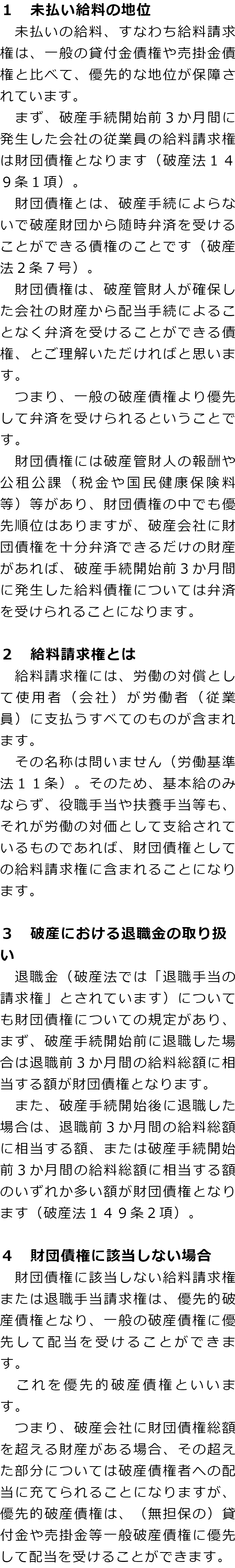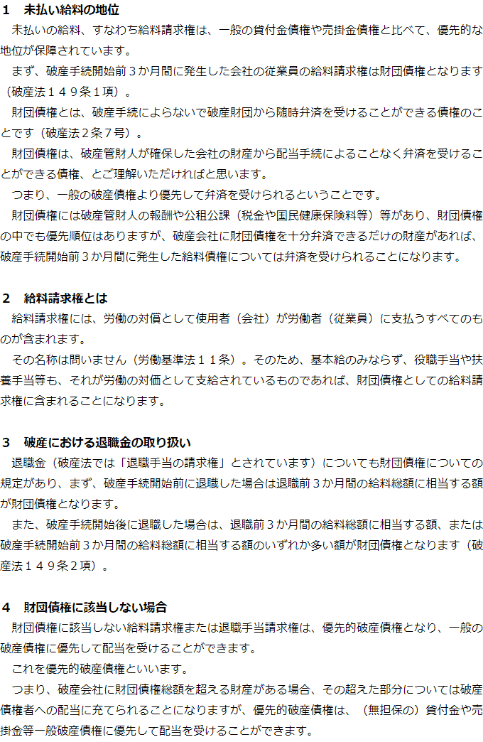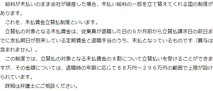 会社が破産した場合の未払いの給料に関するQ&AQ会社が破産した場合、未払いの給料はどうなりますか?Q破産手続きの中で従業員が未払い給料の支払いを受けられない場合、何か救済制度はないのですか? Q会社が破産した場合、未払いの給料はどうなりますか?AQ破産手続きの中で従業員が未払い給料の支払いを受けられない場合、何か救済制度はないのですか?A お役立ち情報・Q&A(目次)お役立ち情報・Q&Aトップお役立ち情報会社破産とリース契約の取り扱い会社破産をすると建物はどうなるのかQ&A会社が破産した場合の未払いの給料に関するQ&A 受付時間 平日 9時~21時、土日祝 9時~18時 夜間・土日祝の相談も対応します(要予約) 所在地 〒286-0033 千葉県成田市花崎町801-1京阪成田ビル6F 0120-41-2403 お問合せ・アクセス・地図