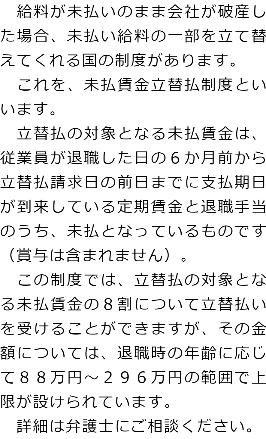 Q会社が破産した場合、未払いの給料はどうなりますか?AQ破産手続きの中で従業員が未払い給料の支払いを受けられない場合、何か救済制度はないのですか?A お役立ち情報・Q&A(目次)お役立ち情報・Q&Aトップお役立ち情報会社破産とリース契約の取り扱い会社破産をすると建物はどうなるのかQ&A会社が破産した場合の未払いの給料に関するQ&A 受付時間 平日 9時~21時、土日祝 9時~18時 夜間・土日祝の相談も対応します(要予約) 所在地 〒286-0033 千葉県成田市花崎町801-1京阪成田ビル6F 0120-41-2403 お問合せ・アクセス・地図